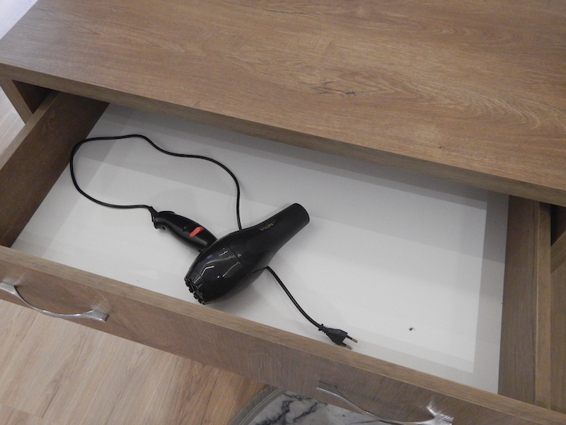 鏡の前の引き出しの中にドライヤーが入ってます。