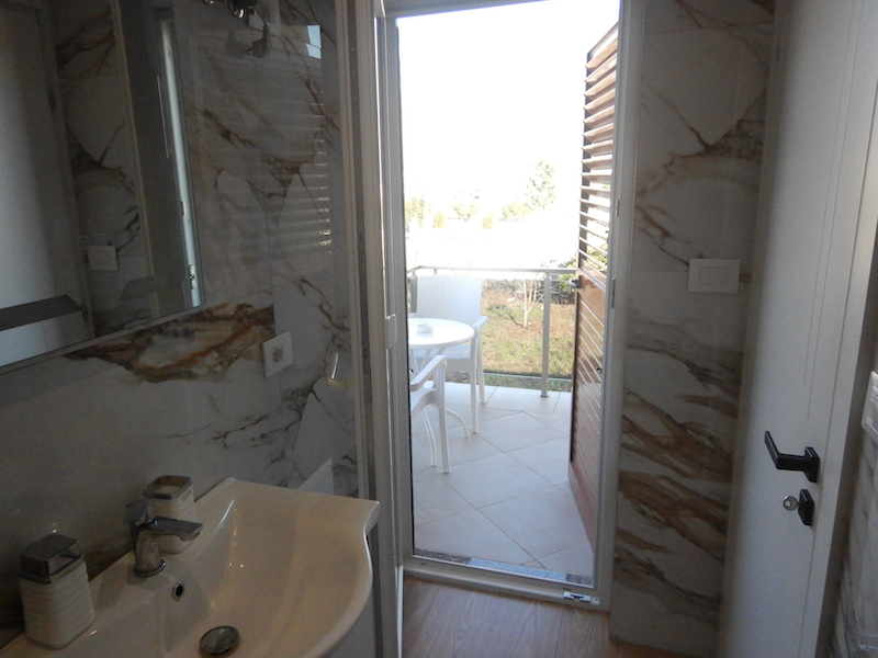 部屋はバルコニー付きで、出入り口はバスルームの中にあります。